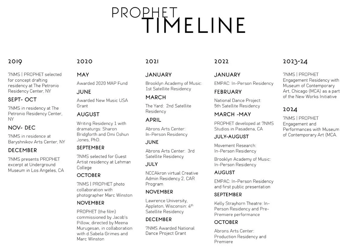 Stemming from the film and performance score, PROPHET’s music album will be available digitally and as a Limited Edition 10” vinyl records (for purchase). Funding for the Prophet Score will support commissioning fees for composer Everett Saunders, violinist Juliette Jones, her string ensemble Rootstock Republic and Chris Williams, an experimental jazz trumpeter. Over the next year, the ensemble will meet 6-8 times at 7NMS’ Asis Studio (in California). This music project will be produced and distributed independently, adjacent to the performance work.